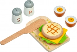 Set sadrži sve za male kuhare: pladanj s kariranim uzorkom, dasku, nož, soljenku i paprenku, kao i raznolik izbor namirnica – pecivo, sir i salatu, jaje, bananu, jabuku, naranču, jagodu i mali kolačić. Naglasak na kvalitetnim materijalima i izdržljivoj izradi jamči dug vijek trajanja i sigurnu igru.