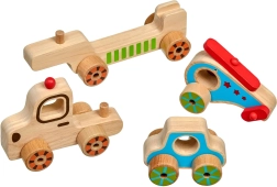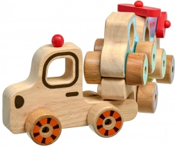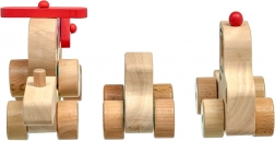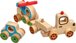 Otkrijte razigrani set od masivnog drva – kamion s prikolicom, autić i helikopter. Djeca mogu uživati u samostalnoj igri i u slaganju cijele garniture. Podržava finu motoriku, koordinaciju oko–ruka i maštu. Dijelovi imaju glatke i sigurne rubove te izražajne boje za lakšu orijentaciju.