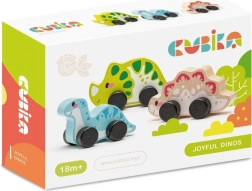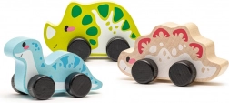 Set sadrži tri drvena dinosaura s kotačićima za lakše kretanje, idealno za malu djecu.