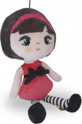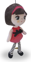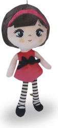 Lutka je odjevena u crvenu haljinu s crnom mašnom koja privlači pažnju.