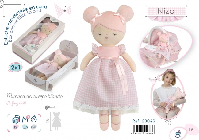 Preslatka plišana lutka Niza u nježnoj ružičastoj varijanti razveselit će svaku malu balerinu. Vrlo je lagana, mekana na dodir i idealna za maženje i za putovanja. Dio seta je pametna kutija 2-u-1 koja se pretvara u kolijevku, pa se dijete može odmah igrati. Lutka je periva na 30 °C i odlikuje se kvalitetnom izradom te profinjenim španjolskim dizajnom.