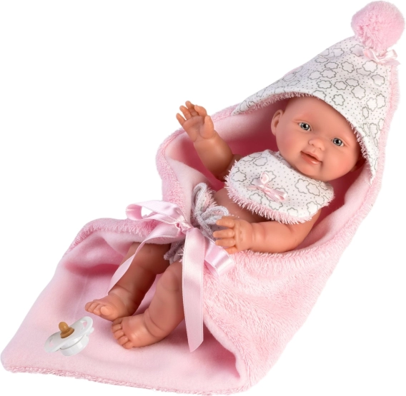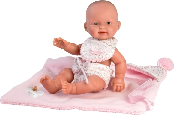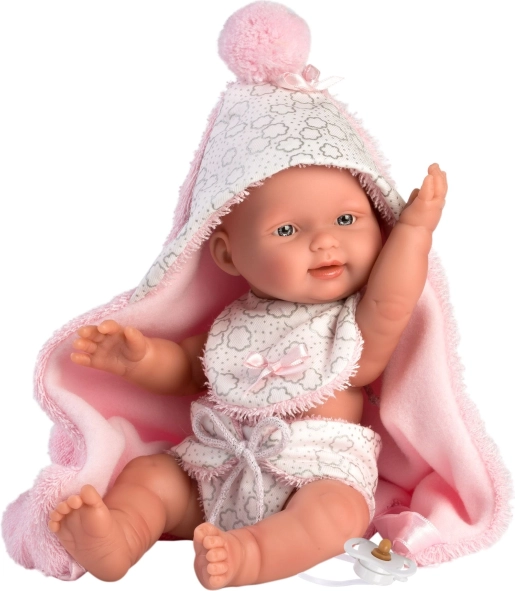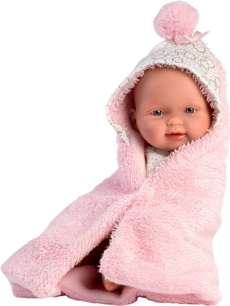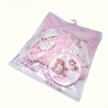 Ovaj dvodijelni komplet dizajniran je posebno za bebinu lutku New Born veličine 26 cm. Sadrži dvostranu dekicu s kapuljačom koja štiti lutku i daje joj izgled prave bebe.