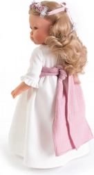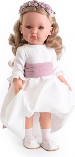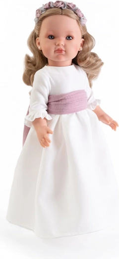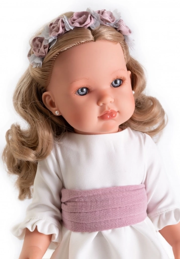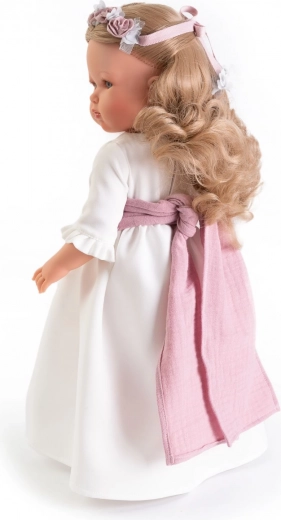 Nježna bijela haljina s mašnom i cvjetnom trakom za kosu pojačava čar lutke. Odabrane kolekcije koriste organski pamuk uzgojen bez kemijske obrade.