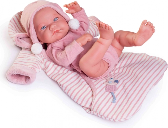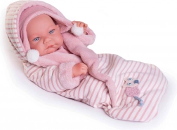 Ova ručno izrađena španjolska lutka predstavlja novorođenče s iznimno vjernim prikazom bebinih naborčića i anatomskih detalja. Cijelo tijelo izrađeno je od omekšanog vinila koji je nježan na dodir i izdržljiv pri svakodnevnoj igri. Bebu je također moguće kupati – no pazite da se trepavice ne namoče.