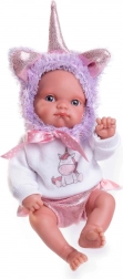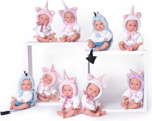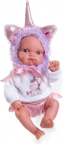 Ova ručno izrađena španjolska lutka prikazuje novorođenu bebu s realističnim detaljima koji potiču prirodnu igru i razvoj mašte. Punovinilno tijelo od omekšanog materijala ugodno je na dodir i omogućuje kupanje lutke u vodi. Komplet upotpunjuje šarmantna odjeća jednoroga koja lutku čini omiljenim poklonom.