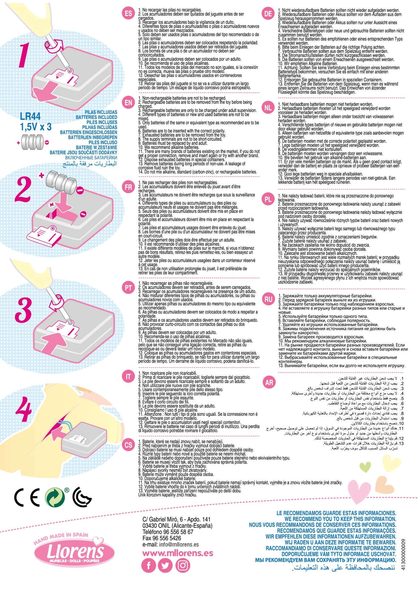 Lutka je ručno izrađena u Španjolskoj s naglaskom na kvalitetu i detalje. Zapakirana je u elegantnu poklon-kutiju, pa je odličan izbor za dar. Uz lutku je moguće kupiti originalnu odjeću iz ponude Llorens za veličinu 33 cm. Baterije su uključene u pakiranje, tako da je lutka odmah spremna za igru nakon uklanjanja sigurnosnog osigurača.