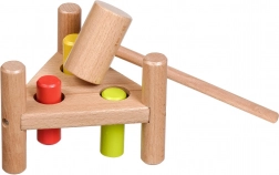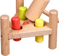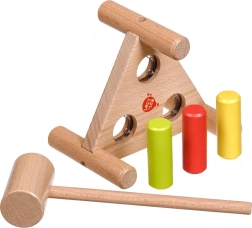 Zabavna drvena čekićarka u netradicionalnom trokutastom obliku potiče finu motoriku, koordinaciju oko–ruka i koncentraciju. Tri obojena klina lako se zabijaju drvenim čekićem, a nakon što su zabijeni, dovoljno je postolje okrenuti i zabava može početi iznova.
