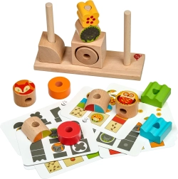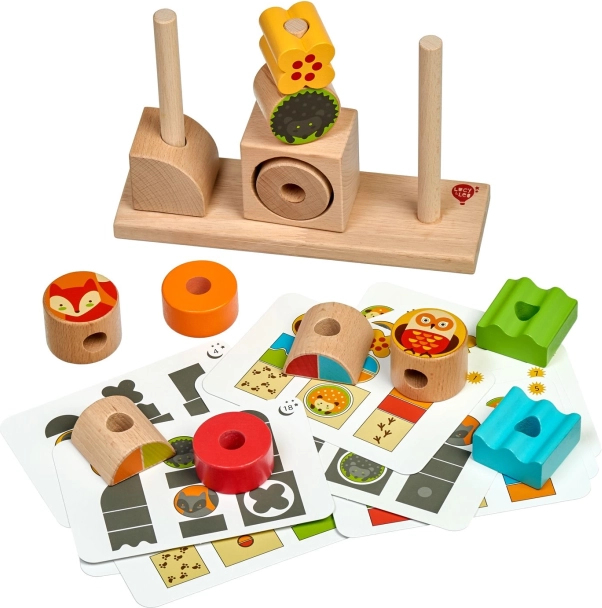 Set sadrži čvrstu drvenu osnovu, raznolike kocke različitih veličina i 14 obostranih karti sa zadacima. Na kockama s motivima životinja nalaze se verzije „dan” i „noć”, što igri daje pripovjednu dimenziju. Nakon igre sve lako spremite u lanenu vrećicu.