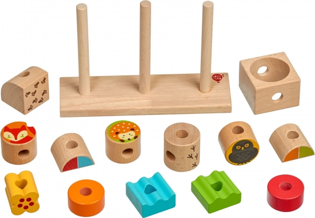 Stabilno postolje i tri klina olakšavaju pravilno slaganje dijelova. Djeca vježbaju finu motoriku i koordinaciju ruka–oko pri nizanju i slaganju.