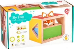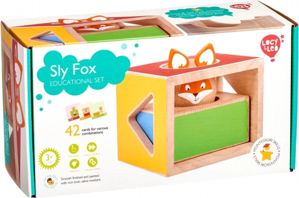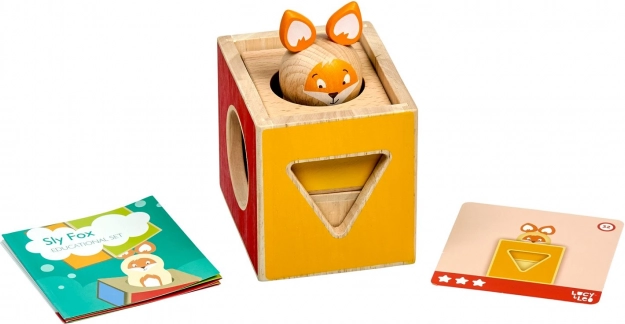 Ova drvena obrazovna igra sadrži tri masivne kocke s izrezima različitih oblika, drvenu figuru lisice i set obostranih karata sa zadacima različite težine. Djeca prema predlošcima slažu i kombiniraju kocke tako da se lisica ispravno “sakrije”, čime treniraju strategiju i prostornu percepciju.
