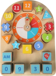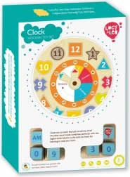 Drvena edukativna ploča LUCY & LEO kombinira slagalicu sa satom. Djeca slažu šarene oblike s brojevima oko brojčanika, okreću kazaljke i tako uče analogno i digitalno vrijeme. Zahvaljujući AM/PM kockama lako shvaćaju razliku između prijepodneva i poslijepodneva te mogu uvježbati i engleske oznake vremena.