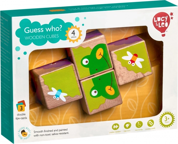 Set od četiri drvene kocke LUCY & LEO s veselima životinjama i njihovim omiljenim poslasticama potiče dječju maštu, finu motoriku i logičko razmišljanje. Od kocaka možete složiti čak 6 različitih slika prema predlošcima. Igračka je od kvalitetnog drva s sigurnom završnom obradom, idealna za malu djecu od 3 godine. Učenje kroz igru, vježbanje boja, koordinacija oko–ruka i zabavno slaganje puzzli u jednom.