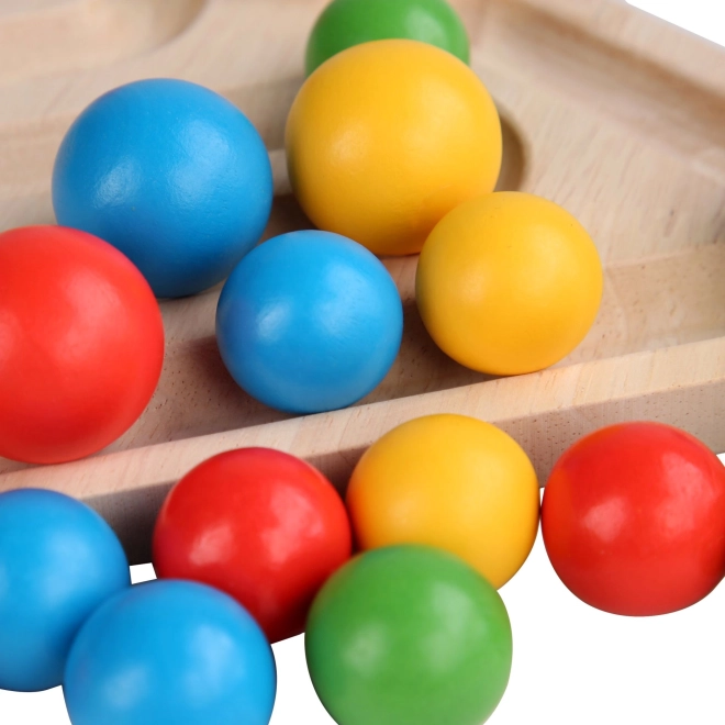 Otkrijte kreativnu zabavu i učenje u jednom. Drvena obostrana ploča trokutastog oblika donosi dvije aktivnosti: sortiranje obojenih kuglica prema 20 predložaka pomoću priložene pincete i žlice te dinamični labirint u kojem djeca vježbaju strpljenje i preciznost. Obojene kuglice nakon igre spremaju se u lanenu vrećicu, tako da je sve uredno na okupu.
