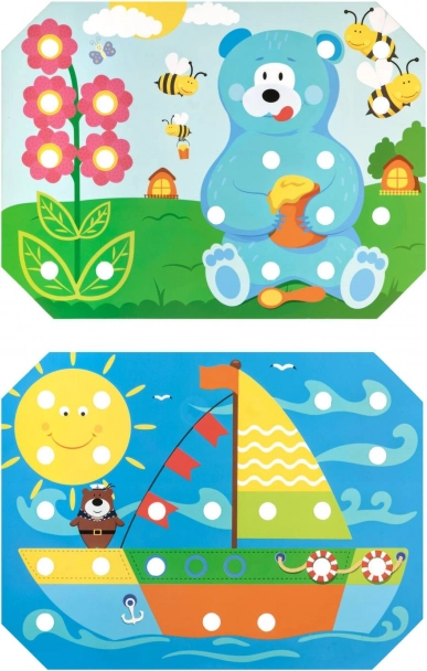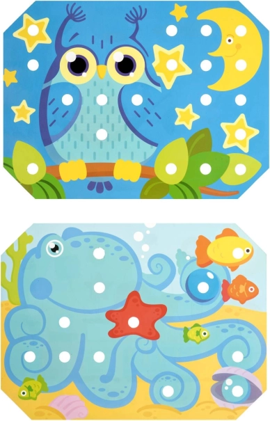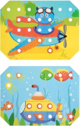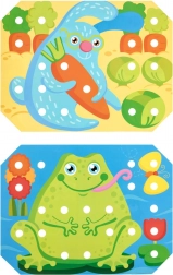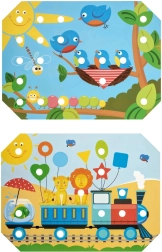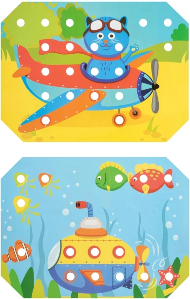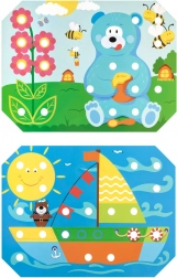 Djeca odaberu jedan od šarenih predložaka, stave ga na drvenu podlogu te ispunjavaju sliku čepićima pomoću pincete ili rukama. Mogu također vježbati provlačenje i vezenje uz pomoć priloženih vezica. Igra prirodno potiče koncentraciju, logiku, strpljenje i preciznost.