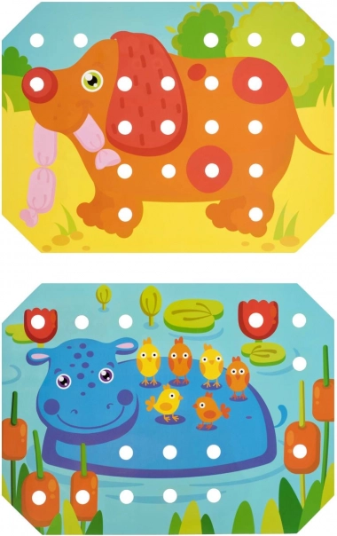 Otkrijte kreativni drveni set za djecu od 3 godine koji razvija finu motoriku, koordinaciju oko–ruka, prepoznavanje boja i strpljenje. Set sadrži 70 velikih šarenih čepića, pincetu, 12 dvostranih predložaka sa životinjama, drvenu podlogu s rupama i 4 šarene vezice za vezenje – idealno Montessori pomagalo za učenje kroz igru.