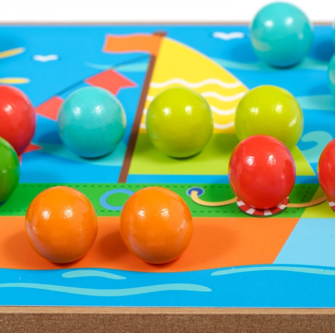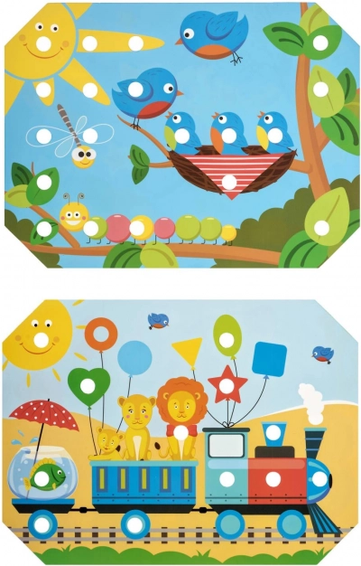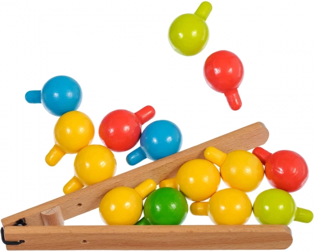Drvena podloga s rupama, šareni čepići i pinceta potiču djecu na precizan hvat te vježbaju finu motoriku i koordinaciju oko–ruka.