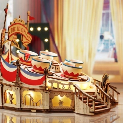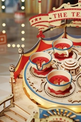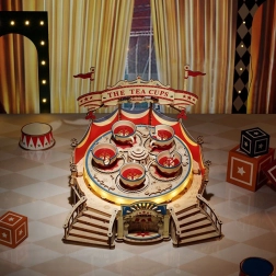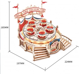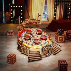 Elegantni vrtuljak „Vrtlog šalica” pretvara vaš interijer u dojmljivu mini atrakciju. Drvena 3D slagalica s detaljnom cirkuskom dekoracijom, nakošenim rotirajućim postoljem i polukružnim stubištem nakon sastavljanja doista oživi: pet šalica se pravilno okreće, podstavec se glatko vrti, a sve zaokružuju efektna LED svjetla i nježna melodija Wind and Moon.