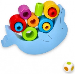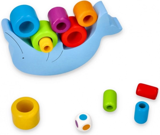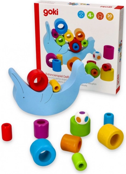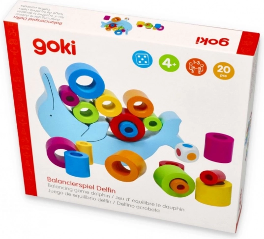 Set sadrži delfina izrađenog od kvalitetnog drveta i 18 šarenih kolutova koje treba strateški posložiti. Priložena kocka za igru dodaje još jednu razinu težine i zabave tako što određuje redoslijed slaganja kolutova.