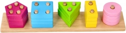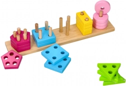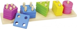 Zabavna drvena slagalica spaja razvrstavanje boja i oblika s navlačenjem na klinove s različitim brojem otvora. Razvija finu motoriku, koordinaciju oko–ruka i logičko razmišljanje, izrađena od masivnog drva za sigurno i izdržljivo igranje.