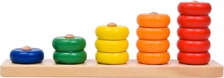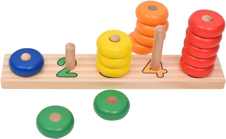 Ova kvalitetna drvena igra za sortiranje izvrsna je za prve korake u svijetu brojeva i boja. Djeca stavljaju jednobojne prstenove na pojedine klinove prema brojkama na podlozi, čime kroz igru usvajaju brojanje, sortiranje i koordinaciju ruka–oko.