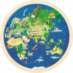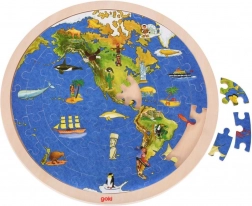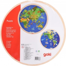 Ova obostrana drvena slagalica GOKI spaja zabavu i učenje. Svaka strana prikazuje jednu polutku s upečatljivim ilustracijama kontinenata, životinja i znamenitosti koje motiviraju djecu na upoznavanje svijeta. Perimetarski urezani obrub pomaže pri slaganju i povećava uspjeh i kod mlađe djece.