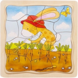 Ove slojevite drvene puzzle prikazuju četiri faze razvoja mrkve – od sjemena do berbe. Svaki sloj ima drugačiju sliku i različit broj dijelova, čime se prirodno povećava zahtjevnost i održava pažnja djece. Čvrsta drvena ploča s okvirom osigurava udobno i stabilno slaganje.
