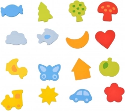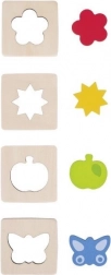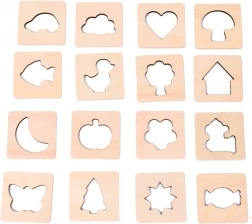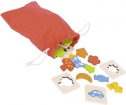 Taktilna igra Prepoznaj oblike u okviru izrađena je od kvalitetnog prirodnog drva. Sadrži 16 okvira dimenzija 5,9 x 5,9 cm i 16 šarenih izrezbarenih oblika koji potiču dodir i osjetilne dojmove djece. Jednostavnim slaganjem i traženjem oblika u vrećici dolazi do zabavnog učenja. Igra se može igrati na više načina, uključujući traženje oblika samo dodirom, što joj daje poseban šarm.