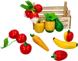 Drvena gajbica puna voća i povrća za malene kuhare i prodavače, idealna za igru trgovine ili tržnice.