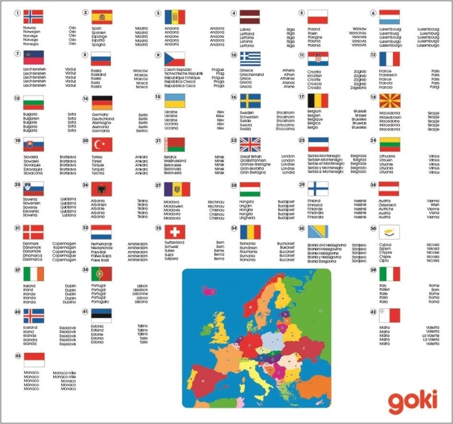 Drvene puzzle Karta Europe marke Goki idealna su obrazovna igračka za djecu i školarce. Dijelovi u obliku pojedinih zemalja slažu se na robusnu drvenu ploču s urezanim otvorima, što olakšava rukovanje i potiče pravilno postavljanje. Svaka zemlja označena je brojem, a u legendi ćete pronaći njezin naziv, glavni grad i državnu zastavu.
