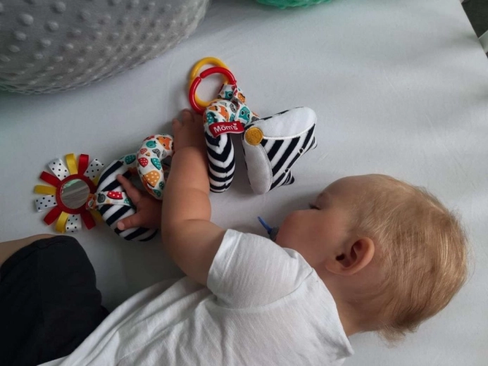 Kontrastni set igračaka za bebe – zvečke, grickalica i viseća traka za kolica