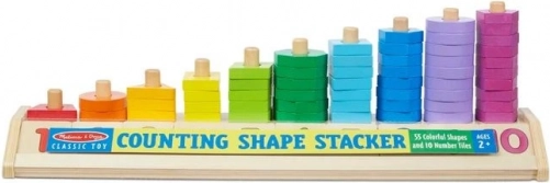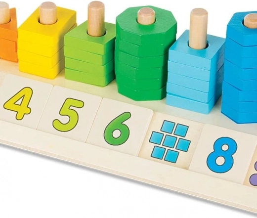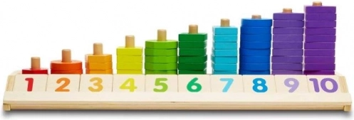 Ova drvena edukativna igračka spaja brojanje, prepoznavanje boja i oblika u jednu zabavnu cjelinu. Na drvenoj podlozi nalazi se 10 klinova s označenim pozicijama brojeva, na koje djeca slažu odgovarajući broj prstenova. Svaka brojka na odvojivom kvadratiću ima boju koja odgovara boji prstenova, što učenje čini znatno preglednijim.