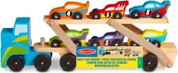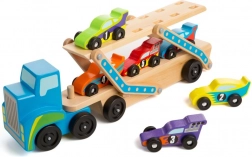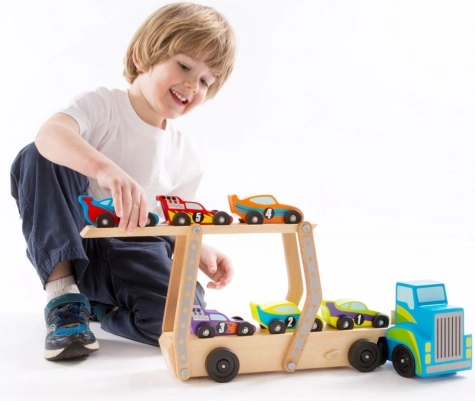 Ovaj drveni transporter automobila nudi izvrsnu priliku za zabavnu i edukativnu igru. Djeca mogu lako utovarivati i istovarivati vozila pomoću uklonjive gornje platforme, što potiče maštu i koordinaciju. Igračka je izrađena od kvalitetnog drva, što osigurava dug vijek trajanja i pruža ugodan taktilni doživljaj.