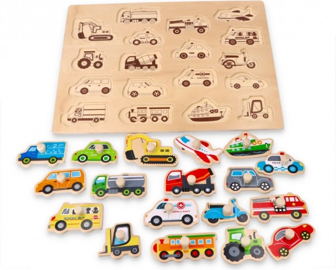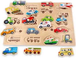 Ova kvalitetna umetaljka od prirodnog drva nudi djeci sigurnu i zanimljivu igru. Svaki dio predstavlja različito vozilo i ima praktične drvene gumb-ručkice za lako držanje malim ručicama. Na podlozi su otisnuti obrisi koji djeci pomažu pravilno smjestiti dijelove te ih uče prepoznavati oblike i boje.