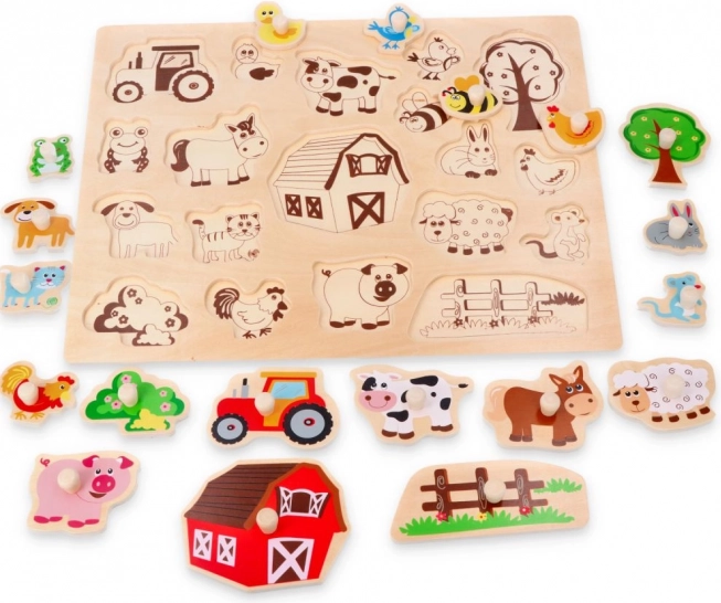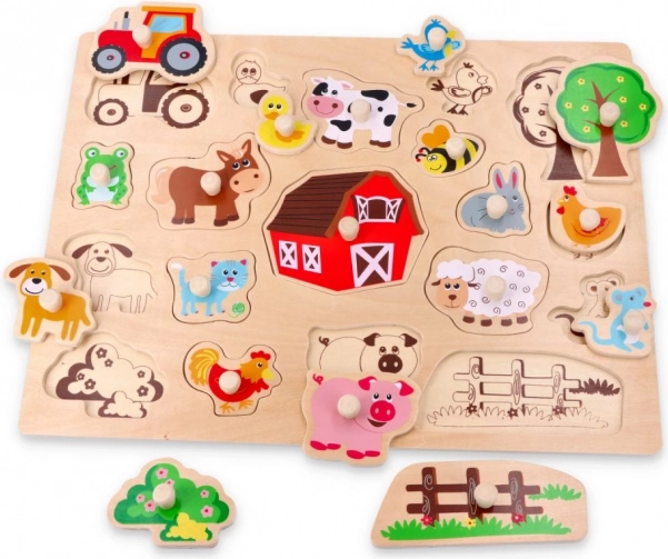 Ova robusna drvena slagalica donosi djeci prvo upoznavanje sa svijetom farme. Šareni lakirani dijelovi s jasnim obrisima lako se uklapaju u podlogu od prirodnog drva. Svaki se dio zahvaljujući ručkici dobro drži i malim rukama, što potiče razvoj fine motorike i strpljenja.