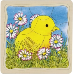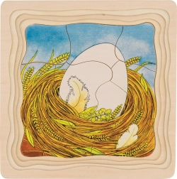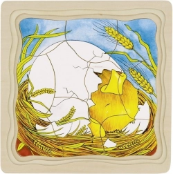 Ova iznimna drvena slagalica podijeljena je u četiri sloja slika, pri čemu svaki predstavlja jednu razvojnu fazu kokoši. Svaki sloj ima drugačiji dizajn i različit broj dijelova, što osigurava raznolikost i potiče dječju maštu. Slagalica je smještena u čvrstu ploču s urezanim rubovima, koja služi kao stabilna podloga za slaganje.