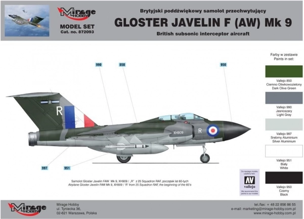 Vjerno izrađen komplet legendarnog britanskog presretača Gloster Javelin F(AW) Mk.9 u mjerilu 1:72. Idealan za ljubitelje zrakoplovne povijesti i modelare od 14 godina. U pakiranju je sve potrebno za trenutačan početak: plastični model 1:72, 5 akrilnih boja, ljepilo i kist.