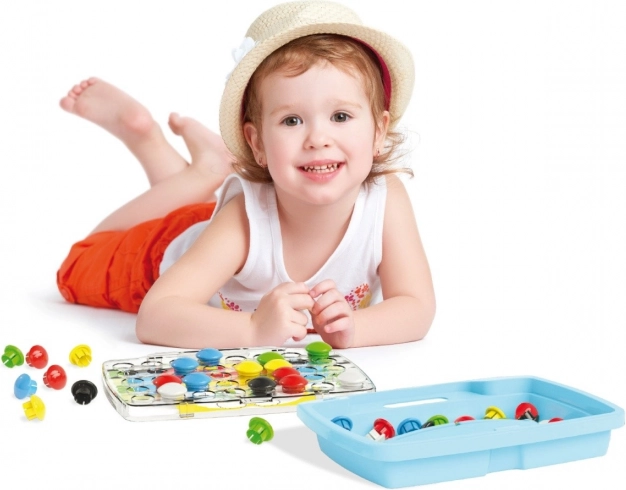 Quercetti Mozaika Pixel Junior je edukativna igračka koja potiče razvoj koordinacije i fine motorike. Set sadrži šarene gumbe i prozirnu ploču na koju se mogu stavljati uzorci pomoću 8 uzornih kartica postavljenih ispod ploče.