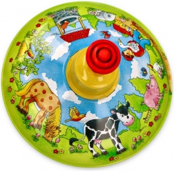 Zvrkalo je ukrašeno veselim ilustracijama koje prikazuju životinje i prizore s farme, što čini igračku privlačnom za malu djecu.