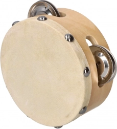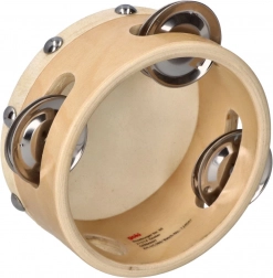 Tamburina ima tradicionalni izgled s prirodnim drvenim tijelom i čvrsto pričvršćenim metalnim činelama.