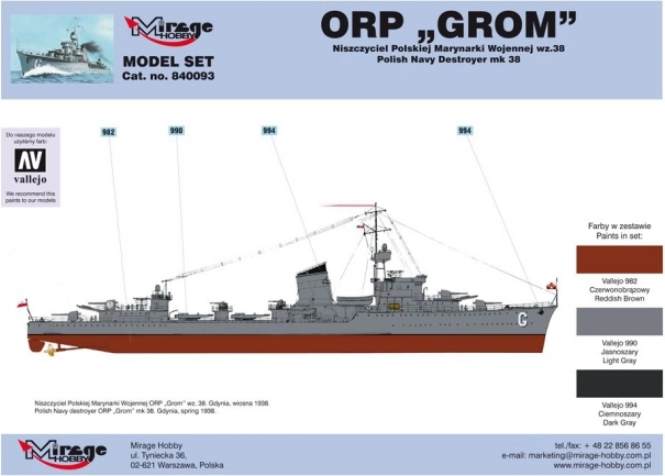 Ovaj model set idealan je za iskusne modelare koji žele izraditi vjernu repliku poljskog razarača torpedinaca ORP 'Grom' iz Drugog svjetskog rata. U mjerilu 1:400, model sadrži detaljne dijelove i pribor koji uključuje:
