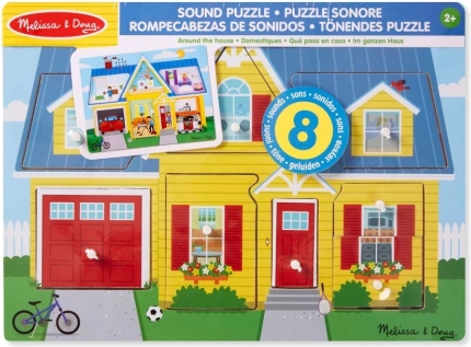 Ova drvena zvučna slagalica prikazuje šarenu kuću punu otkrića. Nakon ispravnog umetanja dijela čuje se odgovarajući zvuk koji motivira djecu na ponavljanje i pomaže shvatiti načelo uzroka i posljedice. Zahvaljujući preglednim ilustracijama, djeca istovremeno uče prepoznavati elemente kućanstva.