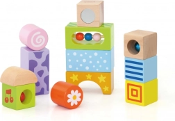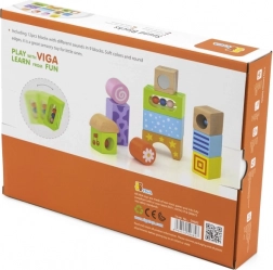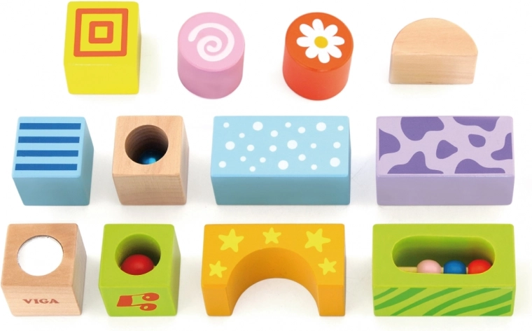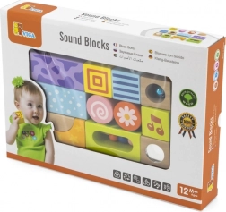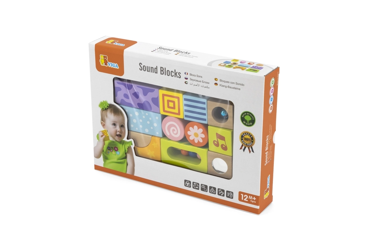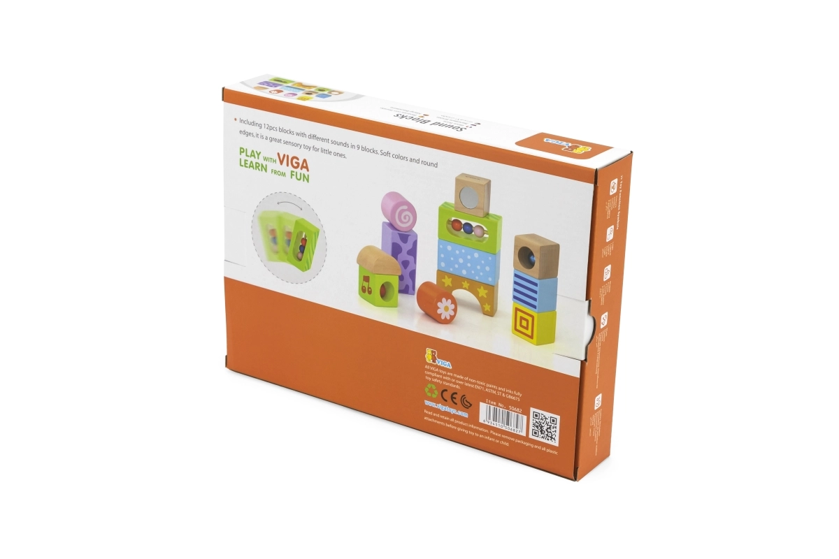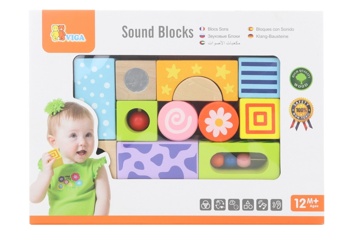 Ovaj set drvenih zvučnih kocki donosi djeci prvu radost slaganja i otkrivanja zvukova. Svaka je kocka osmišljena da privuče bojama, uzorcima i različitim zvučnim elementima (zvončić, zveckanje) koji razvijaju sluh i koordinaciju oko–ruka.