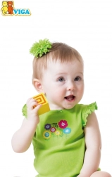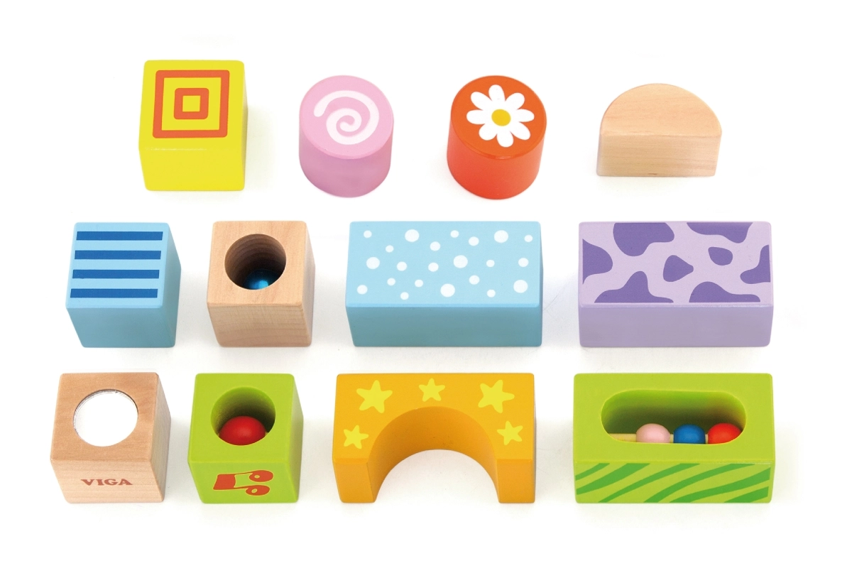Odabrane kocke sadrže zvončiće i zvečke – dijete pri pokretu otkriva različite tonove i ritmove te prirodno razvija slušnu percepciju.