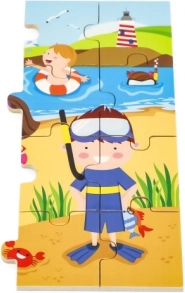 Šarena scena s plaže poziva na slaganje i potiče razgovor o ljetu, vodi i sigurnom ponašanju na otvorenom. Djeca pritom proširuju rječnik i maštu.