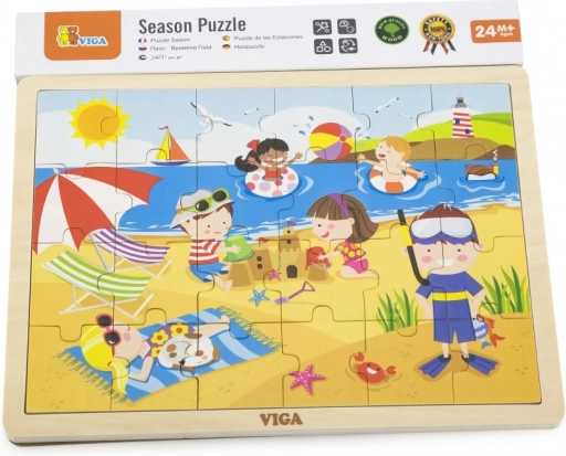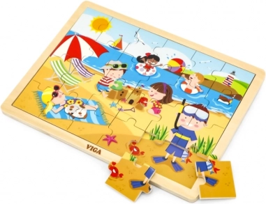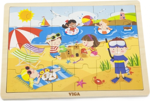 VIGA drvene puzzle ljeto – 24 dijelova idealna su prva slagalica za djecu od 2 godine. Čvrsti drveni dijelovi i okvir pomažu zadržati motiv na mjestu, pa se djeca mogu usredotočiti na slaganje i veselje zbog rezultata. Vesela ljetna ilustracija s plaže prirodno razvija rječnik i maštu.