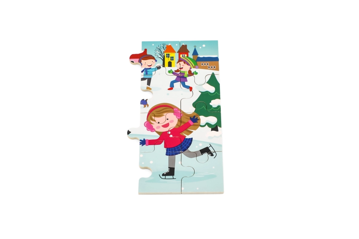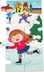 Šarena zimska scena s djecom na snijegu motivira na slaganje te razvija prepoznavanje boja, detalja i situacija.
