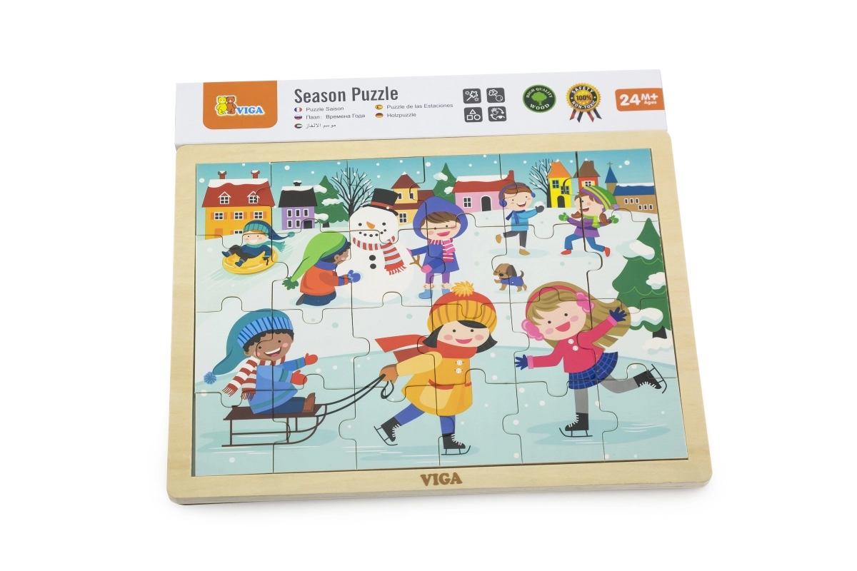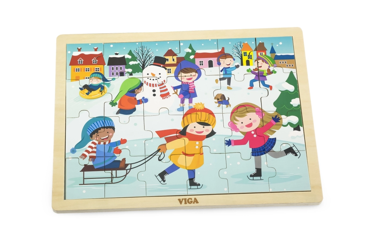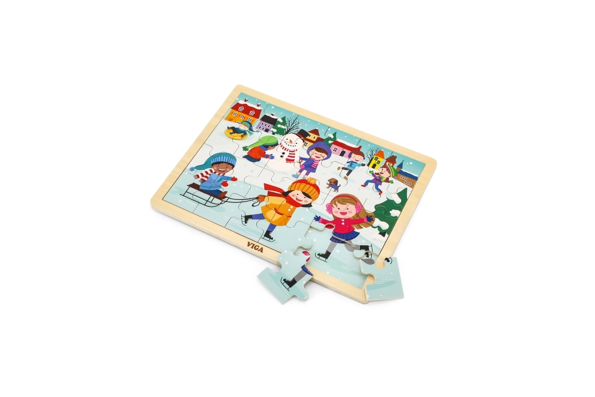 Ove drvene puzzle sa zimskom slikom izvrsna su opcija za djecu od 24 mjeseca. Veličina pojedinih dijelova prilagođena je dječjim rukama, a čvrsta konstrukcija osigurava dug vijek trajanja. Zahvaljujući 24 dijela, djeca vježbaju koncentraciju i doživljavaju radost dovršene slike.