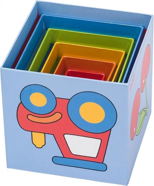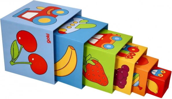Složivi toranj od kocaka GOKI odličan je prvi građevni set za najmlađe. Djeca mogu slagati kocake jednu na drugu, umetati ih jednu u drugu i otkrivati simpatične ilustracije voća, prijevoznih sredstava, igračaka i životinja. Zahvaljujući čvrstom kartonu, kocake izdrže svakodnevnu igru, a pritom su lagane i sigurne za male ruke.