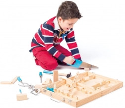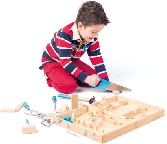Ovaj drveni set alata u kovčežiću nudi djeci realističan doživljaj ‘popravaka’ i stvaranja, na siguran i zabavan način. Zahvaljujući čvrstom kovčežiću s metalnim kopčama, svi dijelovi imaju svoje mjesto i uvijek su spremni za igru kod kuće i na putovanjima. Tijekom igre djeca vježbaju vještinu, koordinaciju oko–ruka i logičko razmišljanje.