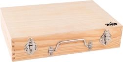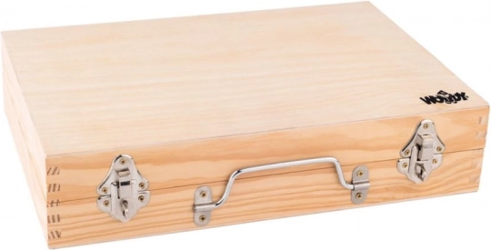 Robusni drveni kovčežić s metalnim zatvaranjem i ručkom štiti alate i omogućuje lako prenošenje kamo god – u sobu, na vikendicu ili kod djedova i baka.